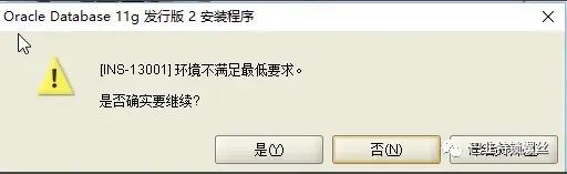 此时弹出【INS-13001 环境不满足最低要求】的提示框,此时可以选择【是】继续安装;也可以选择【否】结束安装,修改配置,防止再次弹出此提示