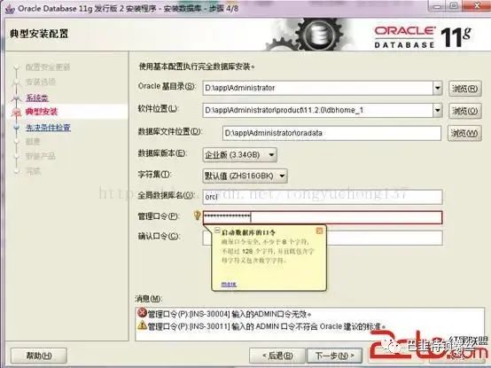 8、进入典型安装选项,选择自己安装数据库的目录、数据库版本、字符集、实例名称和系统用户的密码