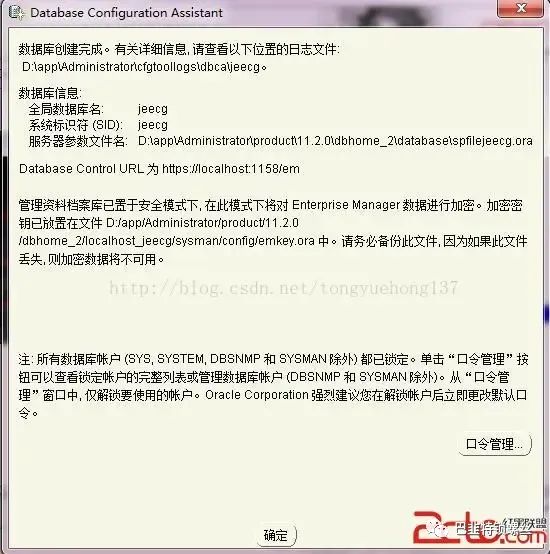 12、安装完成后就会提示安装成功,并会显示日志文件所在目录,此时可以进行口令管理为不同的用户设置口令,如何你不设置,那么默认系统用户名为:system