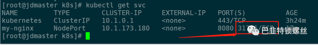 [root@jdmaster k8s]# kubectl get svcNAME TYPE CLUSTER-IP EXTERNAL-IP PORT(S) AGEkubernetes ClusterIP 10.1.0.1 <none> 443/TCP 3h24mmy-nginx NodePort 10.1.173.180 <none> 8080:31756/TCP 17m