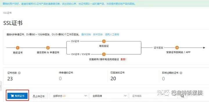 通过阿里云SSL证书服务可以获得由DigiCert提供的免费型DV SSL,为期一年。一个阿云帐户最多签发20张免费证书。支持一键将数字证书部署在阿里云已经开通的云产品中(SLB、Web应用防火墙、DDoS高防IP、CDN),以最小成本在云上应用,统一管理,方便使用。