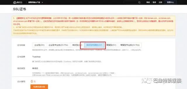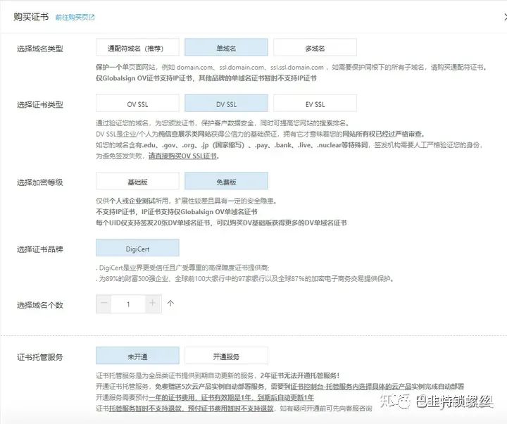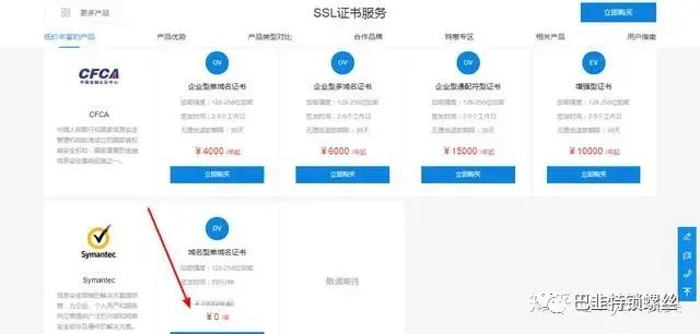 点“单域名”,再点“DV SSL”,最后点“免费版”然后购买即可