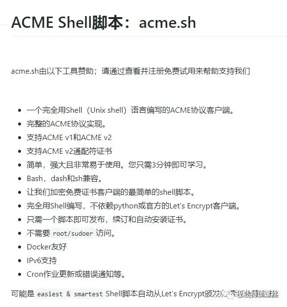 acme.sh是一个知名的用于申请Let’s Encrypt证书的开源项目,也是属于脚本类型,有比较详细的文档,支持自动化更新和自动化部署。唯一缺点,如果有更新后自动部署至多个节点的需求的话,acme.sh无法满足。如果你有一定的命令行使用经验,acme.sh使用起来还是非常方便,强烈推荐!关于更新后自动部署至多个节点的需求,建议使用下面介绍的ohttps。