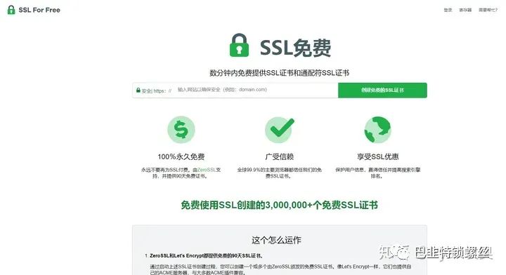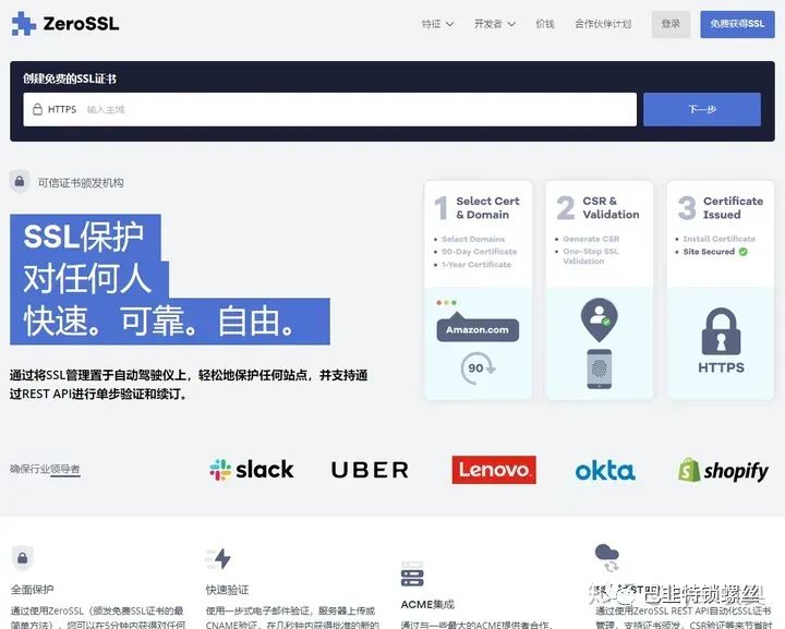 ZeroSSL是一款免费的网站SSL证书申请网站,用户无需下载或安装任何插件,一切操作都在浏览器进行,只要进入ZeroSSL然后填入相关信息,照着凭证产生密钥的步骤做即可获取。