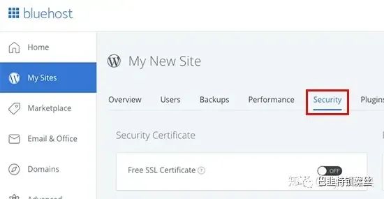 蓝色主机用户可以通过访问“我的网站”»“管理网站”页面找到免费的SSL选项。从这里,您可以切换到“安全性”选项卡并为您的网站打开免费的SSL证书。