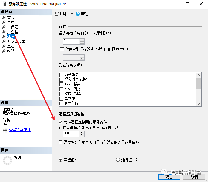 在连接选项中查看是否开启运行远程连接到此服务器,如果没有开启,勾选复选框,确定设置: