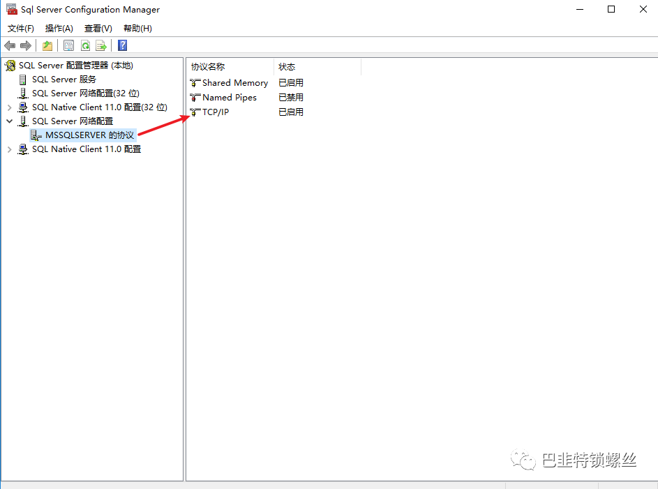 在配置管理器中找到SqlServer网络配置---MSSQLSERVER 的协议---tcp/ip,如果tcp/ip如果状态为未启用则改为启动状态: