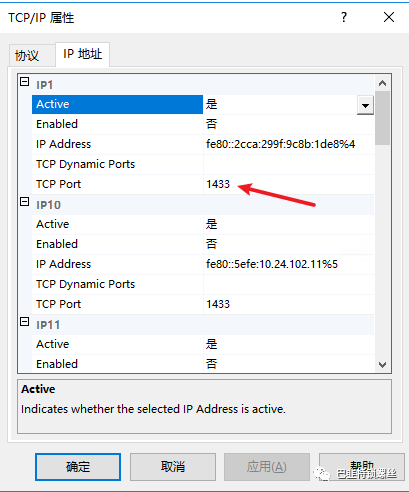 状态启用后,右键点击tcp/ip,进入tcp/ip属性配置页面,切换到IP地址选项卡中查看tcp port(端口号),记住这个端口号一会的设置会用到: