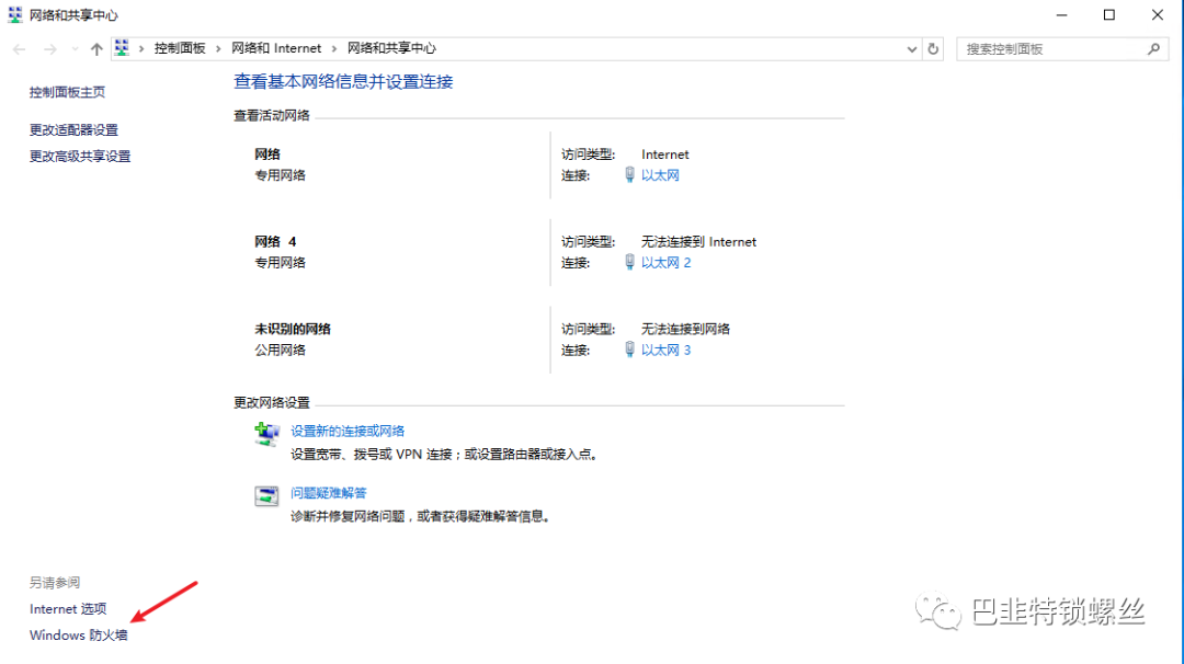 配置服务器防火墙方法如下:在桌面右下角网络连接图标中右键打开网络和共享中心,然后点击页面中左下角的Windows 防火墙: