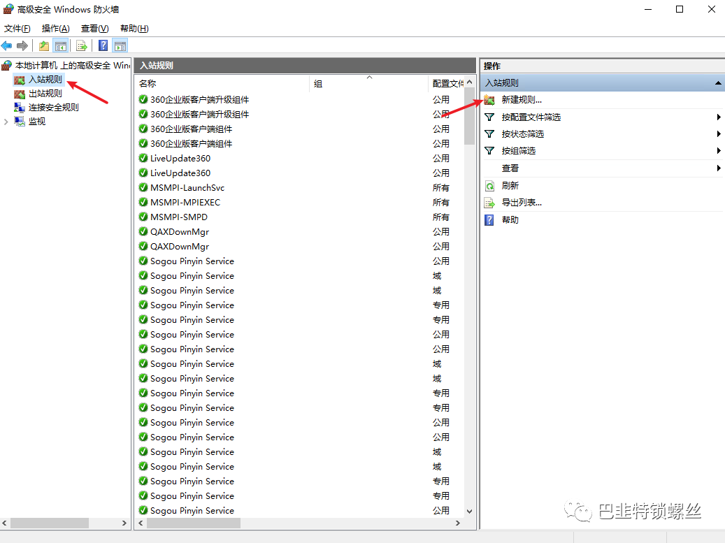 点击入站规则,在右侧选项中选择新建规则: