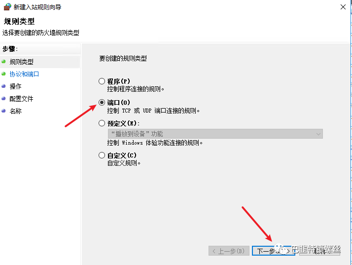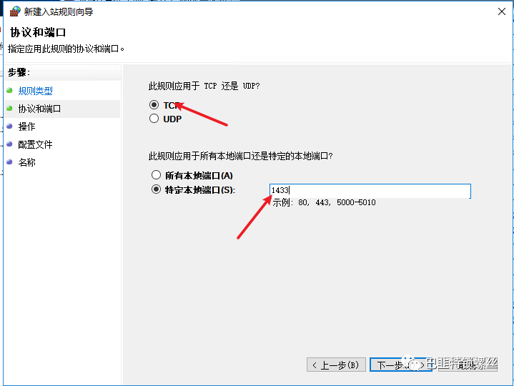 选择tcp选项,并将刚才记住的端口号写好,下一步给这个规则起个名字就可以了: