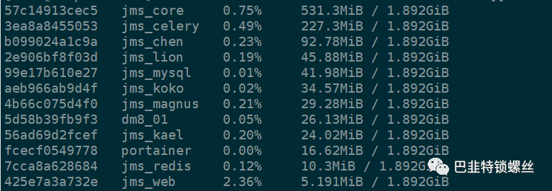 [root@JumpServer ~]#docker stats --no-stream --format "table {{.Container}}\t{{.Name}}\t{{.CPUPerc}}\t{{.MemUsage}}" | sort -k4 -rh57c14913cec5 jms_core 0.75% 531.3MiB 1.892GiB3ea8a8455053 jms_celery 0.49% 227.3MiB 1.892GiBb099024a1c9a jms_chen 0.23% 92.78MiB / 1.892GiB2e906bf8f03d jms_lion 0.19% 45.88MiB / 1.892GiB99e17b610e27 jms_mysql 0.01% 41.98MiB / 1.892GiBaeb966ab9d4f jms_koko 0.02% 34.57MiB / 1.892GiB4b66c075d4f0 jms_magnus 0.21% 29.28MiB / 1.892GiB5d58b39fb9f3 dm8_01 0.05% 26.13MiB / 1.892GiB56ad69d2fcef jms_kael 0.20% 24.02MiB / 1.892GiBfcecf0549778 portainer 0.00% 16.62MiB / 1.892GiB7cca8a628684 jms_redis 0.12% 10.3MiB / 1.892GiB425e7a3a732e jms_web 2.36% 5.191MiB / 1.892GiB