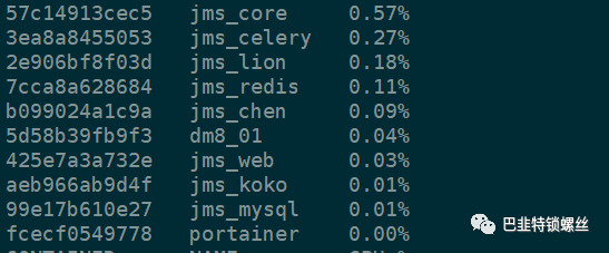 [root@JumpServer ~]#docker stats --no-stream --format "table {{.Container}}\t{{.Name}}\t{{.CPUPerc}}" | sort -k3 -rh57c14913cec5 jms_core 0.57%3ea8a8455053 jms_celery 0.27%2e906bf8f03d jms_lion 0.18%7cca8a628684 jms_redis 0.11%b099024a1c9a jms_chen 0.09%5d58b39fb9f3 dm8_01 0.04%425e7a3a732e jms_web 0.03%aeb966ab9d4f jms_koko 0.01%99e17b610e27 jms_mysql 0.01%fcecf0549778 portainer 0.00%CONTAINER NAME CPU %56ad69d2fcef jms_kael 0.00%4b66c075d4f0 jms_magnus 0.00%