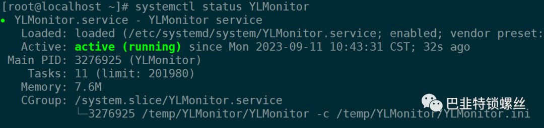 [root@localhost ~]# systemctl status restart-ylmonitor.service● restart-ylmonitor.service - YLMonitorLoaded: loaded (/etc/systemd/system/restart-ylmonitor.service; enabled; vendor preset: disable>Active: inactive (dead)[root@localhost ~]# systemctl start restart-ylmonitor.service[root@localhost ~]# systemctl status restart-ylmonitor.service● restart-ylmonitor.service - YLMonitorLoaded: loaded (/etc/systemd/system/restart-ylmonitor.service; enabled; vendor preset: disable>Active: active (exited) since Mon 2023-09-11 10:43:31 CST; 2s agoProcess: 3276910 ExecStart=/bin/systemctl restart YLMonitor.service (code=exited, status=0/SUCC>Main PID: 3276910 (code=exited, status=0/SUCCESS)9月 11 10:43:31 localhost.localdomain systemd[1]: Starting YLMonitor...9月 11 10:43:31 localhost.localdomain systemd[1]: Started YLMonitor.[root@localhost ~]# systemctl status YLMonitor● YLMonitor.service - YLMonitor serviceLoaded: loaded (/etc/systemd/system/YLMonitor.service; enabled; vendor preset: disabled)Active: active (running) since Mon 2023-09-11 10:43:31 CST; 32s agoMain PID: 3276925 (YLMonitor)Tasks: 11 (limit: 201980)Memory: 7.6MCGroup: /system.slice/YLMonitor.service└─3276925 /temp/YLMonitor/YLMonitor -c /temp/YLMonitor/YLMonitor.ini9月 11 10:43:31 localhost.localdomain systemd[1]: Started YLMonitor service.9月 11 10:43:31 localhost.localdomain YLMonitor[3276925]: 2023/09/11 10:43:31 [I] [root.go:220] s>9月 11 10:43:31 localhost.localdomain YLMonitor[3276925]: 2023/09/11 10:43:31 [I] [service.go:301>9月 11 10:43:31 localhost.localdomain YLMonitor[3276925]: 2023/09/11 10:43:31 [I] [proxy_manager.>9月 11 10:43:31 localhost.localdomain YLMonitor[3276925]: 2023/09/11 10:43:31 [I] [control.go:172>