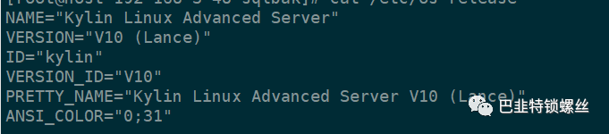 [root@host-192-168-3-48 conf]# cat etc/os-releaseNAME="Kylin Linux Advanced Server"VERSION="V10 (Lance)"ID="kylin"VERSION_ID="V10"PRETTY_NAME="Kylin Linux Advanced Server V10 (Lance)"ANSI_COLOR="0;31"