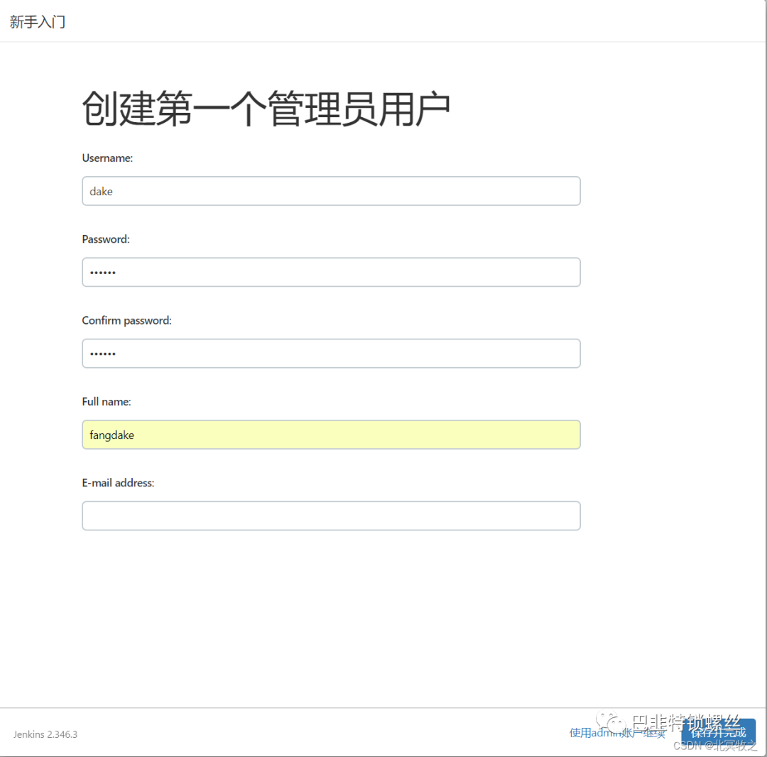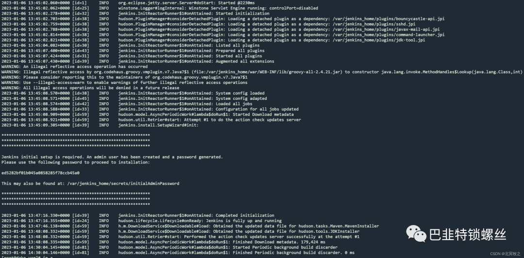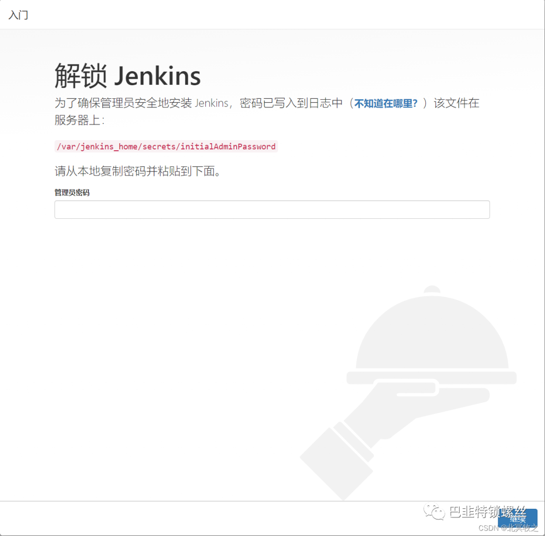 创建Jenkins后会自动创建admin用户和对应的密码,密码所在的位置上图已经给出,我们访问该文件即可得到密码: