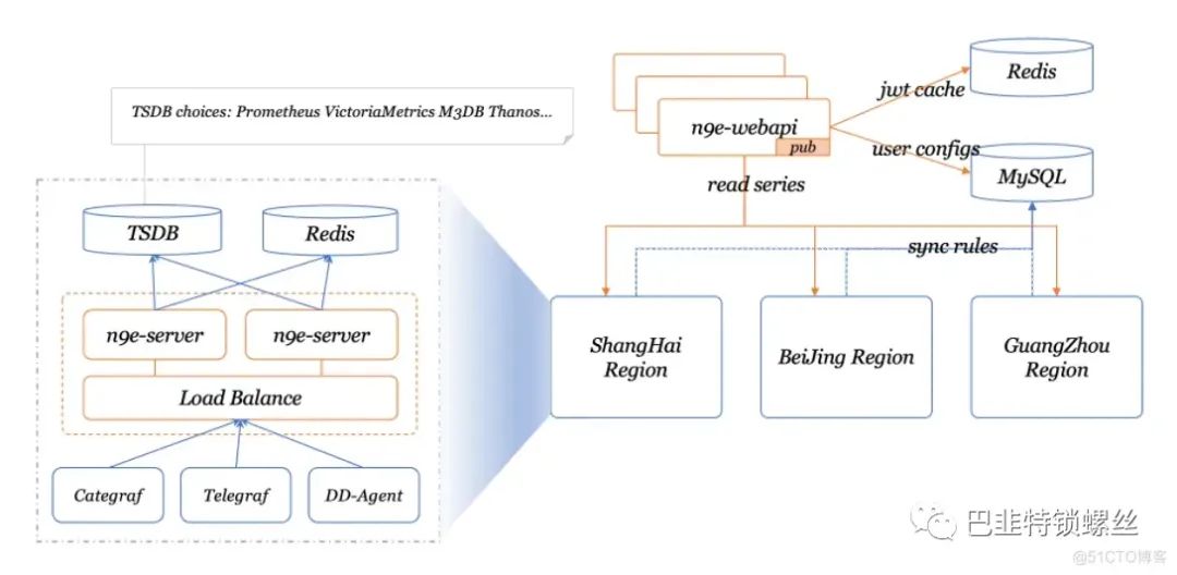 兼容并包,设计上比较开放,支持对接 Categraf、Telegraf、Grafana-Agent、Datadog-Agent 等采集器,还有 Prometheus 生态的各种 Exporter,时序库支持对接 Prometheus、VictoriaMetrics、M3DB、Thanos 等。