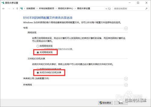 接下来,在打开的“高级共享设置”界面中,分别勾选“关闭网络发现”和“关闭文件和打印共享”两个功能选项,点击“保存设置”按钮。这样就实现了电脑网络共享功能的关闭操作。