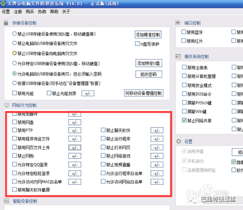 同时,考虑到造成电脑文件被窃取的原因是多方面的,对此我们可以根据实际需要,在“网络行为控制”栏目中,勾选相应的功能选项,从而实现电脑文件的更进一步的保护功能。可以通过禁止网盘上传下载功能,限制特定程序的运行,以及对打开网页、观看视频、收发电子信箱等网络行为进行管理。