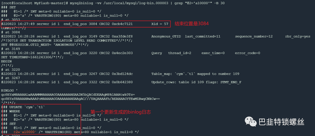 [root@localhost tmp]# mysqlbinlog -vv usr/local/mysql/log-bin.000007 | egrep 'aaaaa1' -B 30