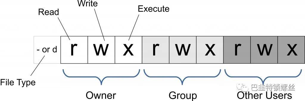 Linux/Unix 的文件调用权限分为三级 : 文件所有者(Owner)、用户组(Group)、其它用户(Other Users)。