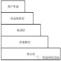 地图能够以二维、三维的形式进行展示,同时支持调用 OGC(Open Geospatial Consortium)地理信息联盟指定的空间数据服务规范下的 WMS、WMTS、ArcGIS 等多种地图服务图层。三维球体上能够进行点、线、面、体等实体的创建、gl TF/glb 三维模型的加载以及基于时间轴进行动画模拟等的动态效果等其他功能实现,Cesium 于 2016 年推出了 3D Tiles 格式规范后,三维地球也能够支持对倾斜摄影、点云等大型模型数据的加载。Cesium 按照其功能层级不同,由下到上可主要分为核心层、渲染器层、场景层和动态场景层四层(图 2-2)。