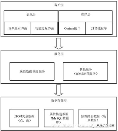 本地 Cesium 系统架构采用流行的 B/S(浏览器/服务器)架构方式,根据各个层次实现的功能的不同,系统整体可分为客户层、服务层以及数据存储层三个层次。其系统整体架构实现如下图所示。