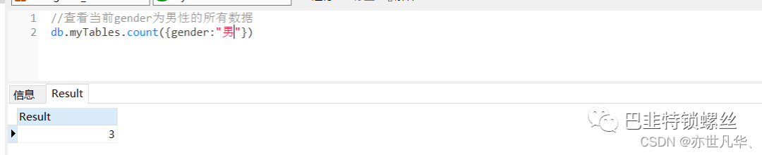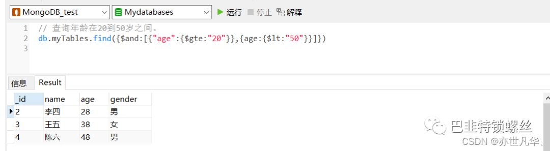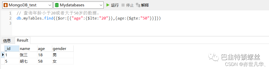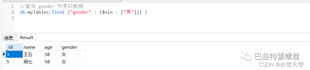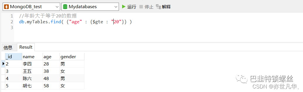db.集合名称.find( {"field" : {$gt : value}} ) // 大于:field > valuedb.集合名称.find( {"field" : {$lt : value}} ) // 小于:field < valuedb.集合名称.find( {"field" : {$gte : value}} ) // 大于等于:field >= valuedb.集合名称.find( {"field" : {$lte : value}} ) // 小于等于:field <= valuedb.集合名称.find( {"field" : {$ne : value}} ) // 不等于:field != value