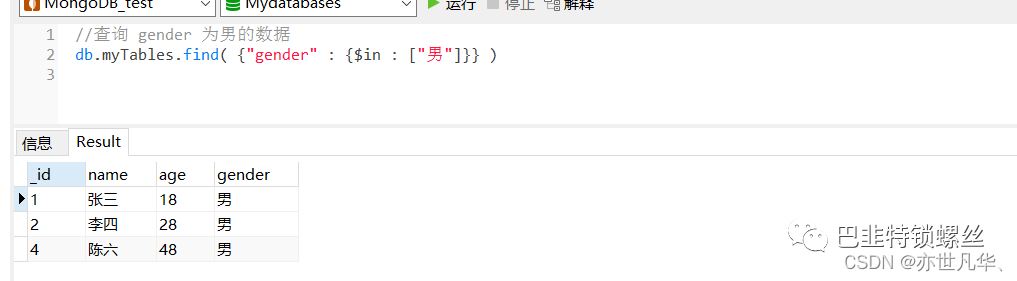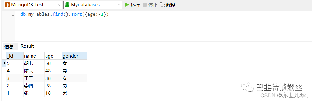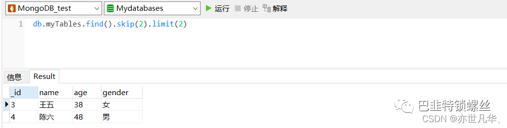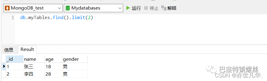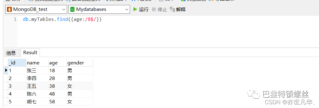 db.myTables.insertMany([{"_id":"1","name":"张三","age":"18","gender":"男"},{"_id":"2","name":"李四","age":"28","gender":"男"},{"_id":"3","name":"王五","age":"38","gender":"女"},{"_id":"4","name":"陈六","age":"48","gender":"男"},{"_id":"5","name":"胡七","age":"58","gender":"女"}])
