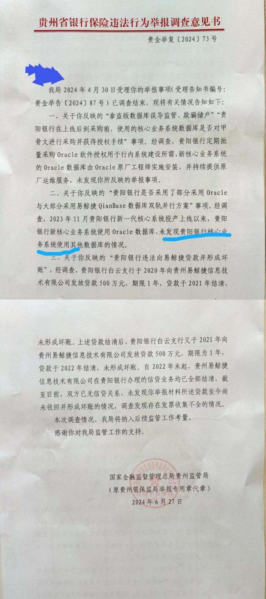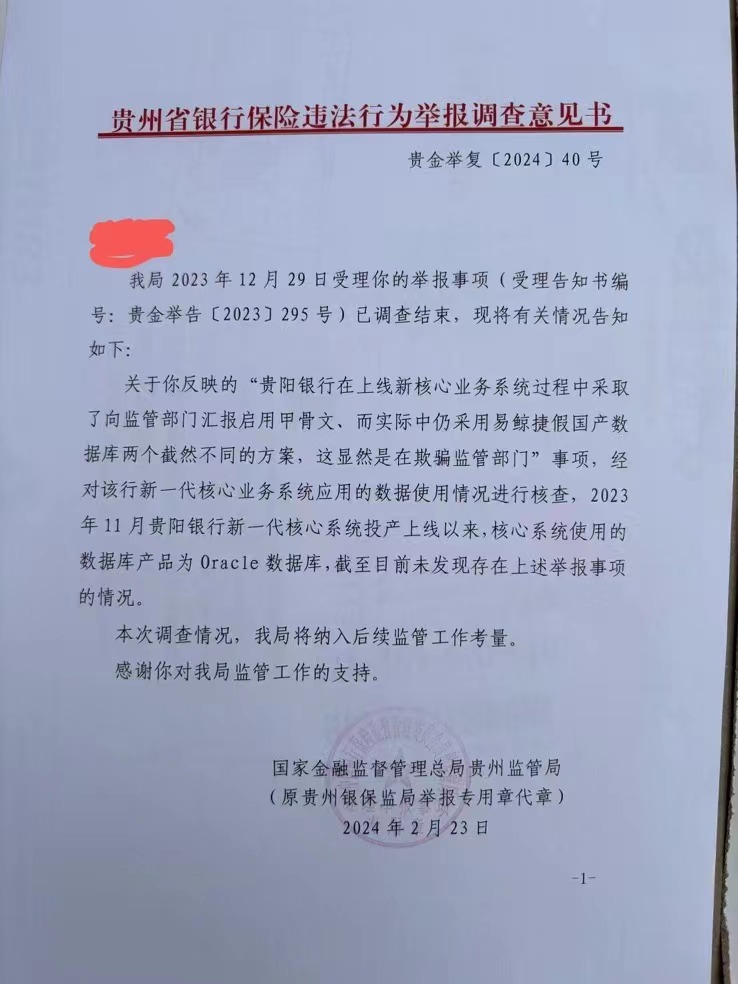 另一份于2月23日出具的调查意见书(贵金举复〔2024〕40号)则显示,关于“贵阳银行在上线新核心业务系统过程中采取了向监管部门汇报启用甲骨文、而实际中仍采用易鲸捷假国产数据库两个截然不同的方案,这显然是在欺骗监管部门”事项,经对该行新一代核心业务系统应用的数据使用情况进行核查,2023年11月贵阳银行新一代核心系统投产上线以来,核心系统使用的数据库产品为Oracle数据库,截至彼时未发现存在上述举报事项的情况。