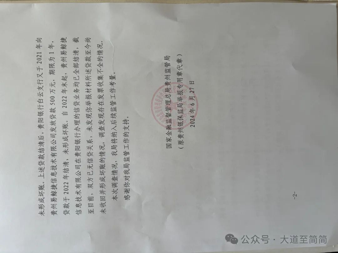 2024年6月27日,国家金融监督管理总局贵州监管局出具《贵州省银行保险违法行为举报调查意见书》,即贵金举复[2024]73号: