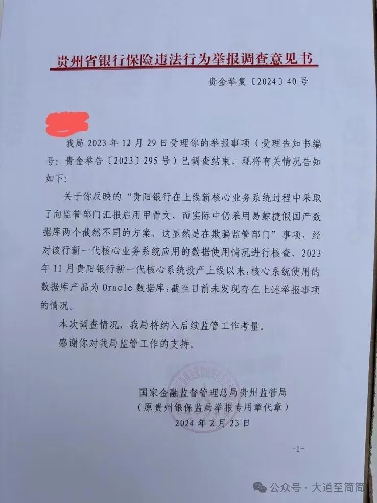 其实,此前的2024年2月23日,国家金融监督管理总局贵州监管局出具《贵州省银行保险违法行为举报调查意见书》,即贵金举复[2024]40号,已经回应了“贵阳银行启用甲骨文”,但总有些一些别有用心的人反复混淆视听并试图继续浑水摸鱼。回复如下: