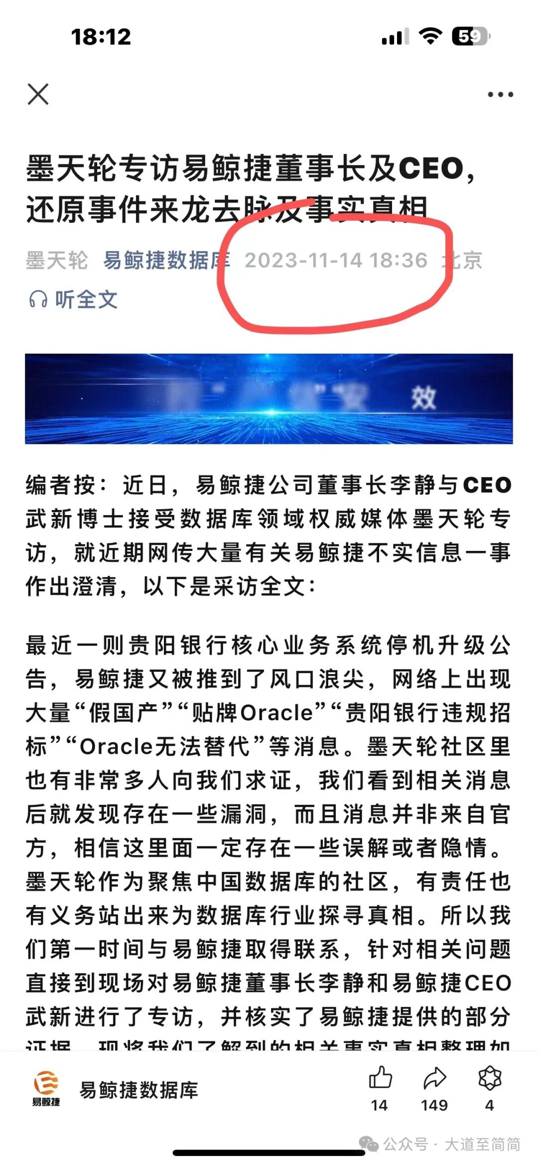 当时(2023年11月3日)贵阳银行启用甲骨文上线核心业务系统时,面对舆论关注和贵阳银行的沉默,承担贵阳银行4.27亿元国产化替代工程的公司—易鲸捷却谎称:贵阳银行本次停机为例行升级。其核心业务系统分两阶段,第一阶段中大多数系统使用易鲸捷分布式数据库QianBase成功上线,部分采用Oracle数据库与QianBase数据库双轨并行方案,第二阶段将采用易鲸捷QianBase数据库全面替换Oracle数据库做为主库运行,最终实现全国产技术栈的项目总体建设目标。