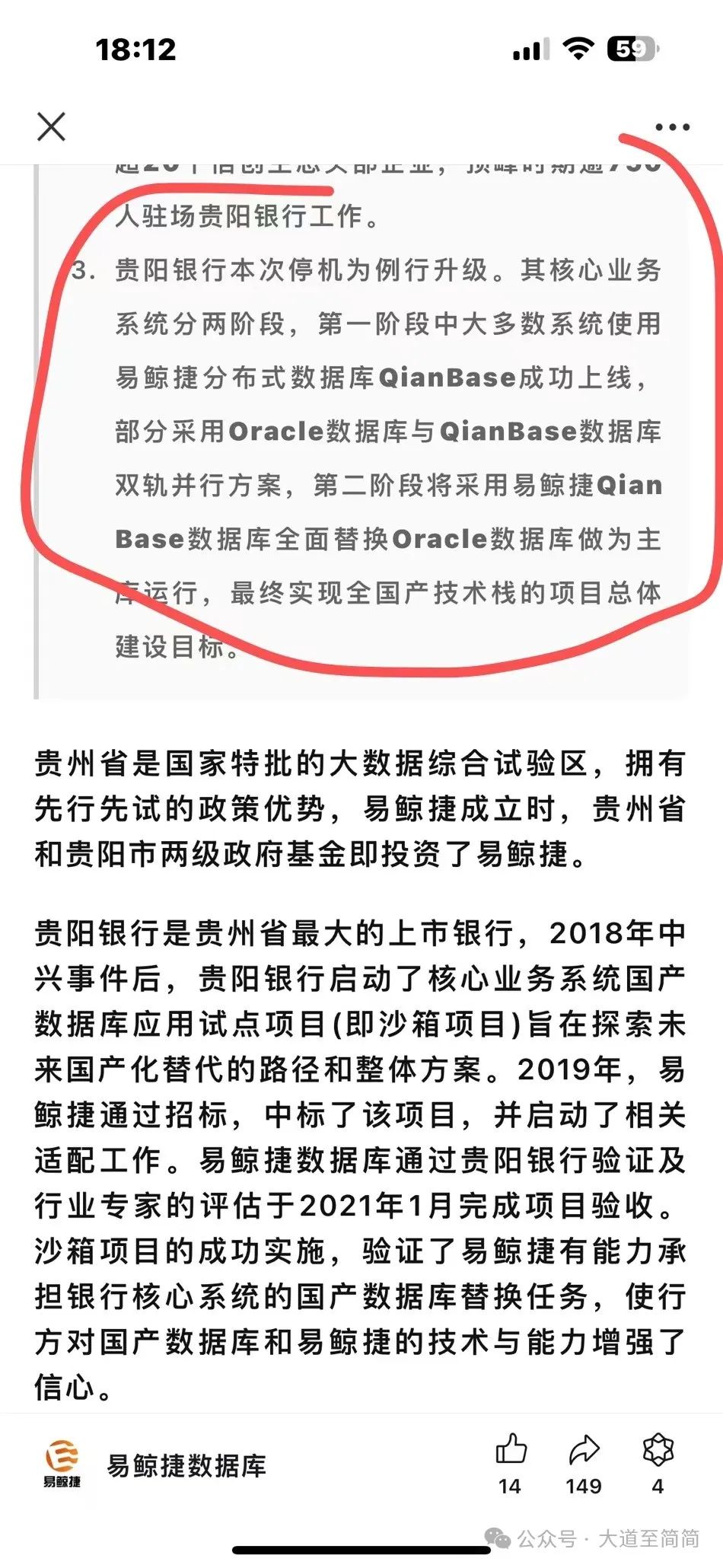 (快讯)甲骨文是贵阳银行新核心业务系统使用且是唯一使用的数据库,“贵阳银行耗资4.27亿元的国产化替代工程破产”终于水落石出。