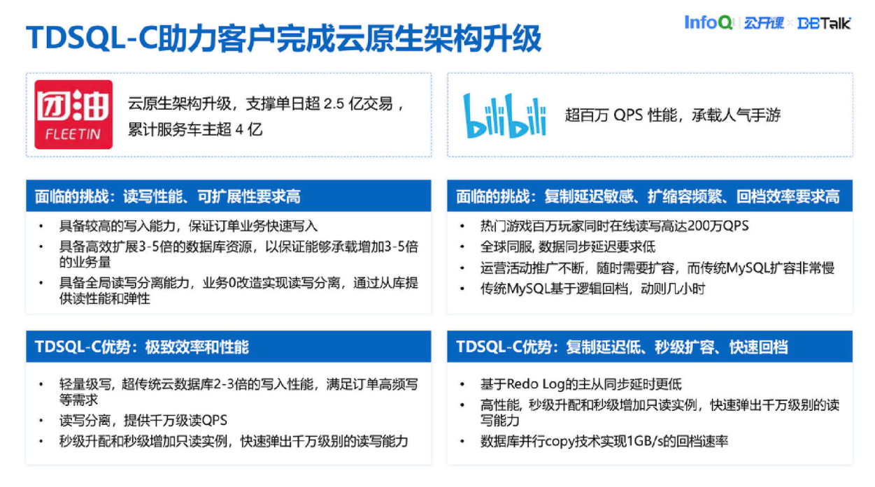 上面也是我们重点在支持的两个客户,一个是团油,是为车主服务的 APP。他们经常会有大量秒杀场景需要提前准备,提前测算当时的活动可能会有多少峰值流量,预购计算资源。使用云原生数据库架构升级以后,我们通过秒级升配和秒级横纵扩展,使得他们在这方面的能力大幅提升。游戏行业上,我们支持了 B 站的百万 QPS 性能提升,承载了他们的一个人气手游的运营,给他们提供了全球同服的产品能力,而且维护成本也下降了,用户的游戏体验也更好了,跨国际同步延迟从原先的十几秒下降到了百毫秒级别。