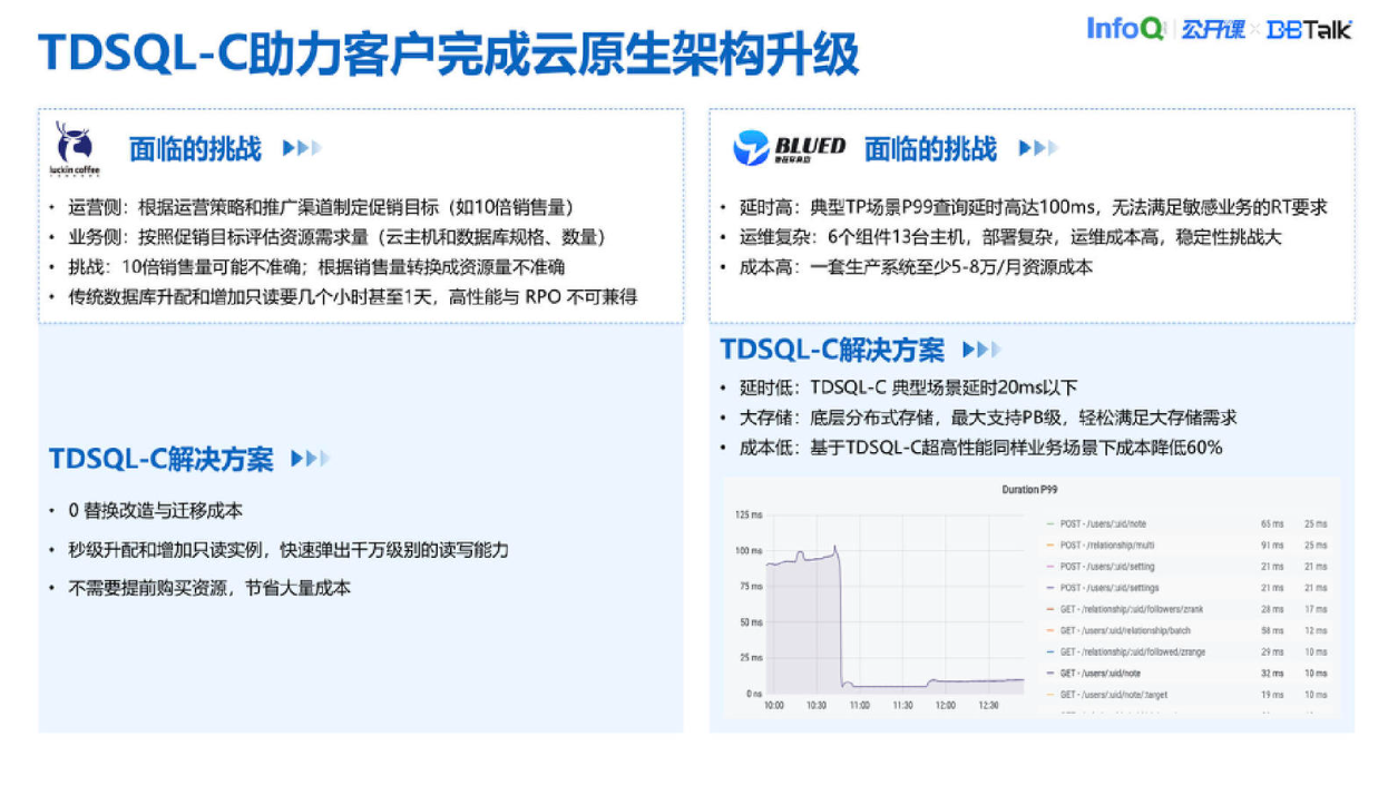 上面这两个社交领域客户也是从传统数据库直接升级到了云原生数据库,是非常典型的案例。他们有大量海外业务,社交类的业务又对延迟非常敏感,原本的开源分布式数据库方案成本高,效率增加并不明显。通过我们的替换,首先把他的成本打下来,打到了原先 1/3。第二个基于云原生数据库的海量存储,我们也给他们做了数据的归一聚合,之前 16 个实例合并到了一个大的实例上,不仅减少了他们多库多实例的运维压力,同时也提升了原先多个实例的性能。