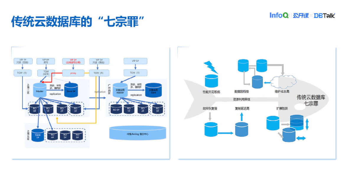 上图是典型的传统云数据库架构示意。传统云数据库一直以来还在沿用搬迁式的模式,这种架构中,云数据库提供的服务更多类似于云上托管,帮助用户实现、维护高可用组件和生态链路,但实际上数据库软件同传统的 MySQL 软件没有什么区别,只是从云下用户 IDC 部署变成了基于云厂商提供的底座。所以它依然没有突破传统数据库遇到的性能、回档效率、维护成本等方面的瓶颈。