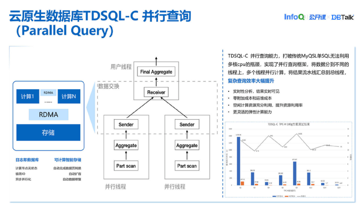 我们基于云原生的架构,在内核上实现了并行查询的能力,打破了 MySQL 单个 SQL 只能利用一个核心的设置。我们能够让单个 SQL 有多个进程来执行,利用机器上多核 CPU 的能力来保证单个复杂的 SQL 在这种情况下能够有很好的执行效率。