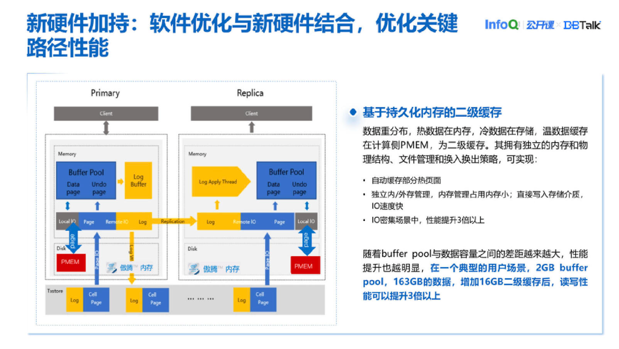 我们做的第三件事是基于硬件的持久化内存。在计算节点上除了原先的内存,以及存储侧冷数据以外又加了一层微数据,提升用户的读写性能。比如 buffer pool 里的数据被淘汰后,我们可以直接写入到计算节点上的持久化内存的二级缓存里,通过二级缓存的加持使读写性能比原先要基于大量 remote IO 的场景有更好的提升。