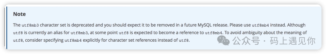 在 MySQL 官方文档中,介绍了支持的编码方式之后,还有一段醒目的提醒: