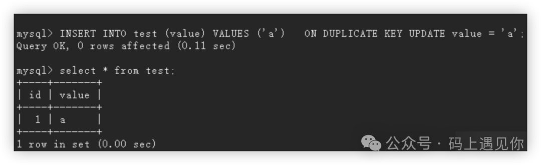 此时,由于 value 列存在唯一键约束,并且已经存在一条记录 value='a',所以不会插入新记录,而是会执行更新操作。但即便如此,自增主键 id 的计数器依然会增加。