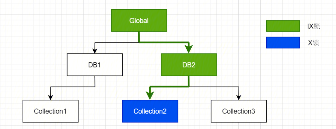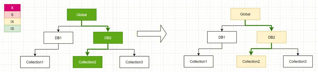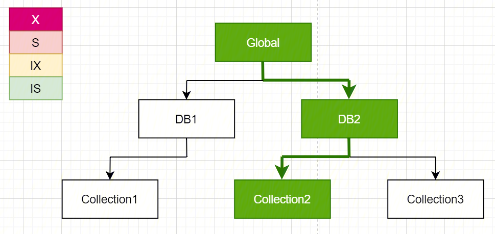 如请求 A 在对 collection2 执行读操作,此时需要获取 collection2 的 IS 锁(Intent Shard Lock),由上述资源层级优先级关系,需要向上依次获得 DB2 的 IS 锁以及 Global 的 IS 锁: