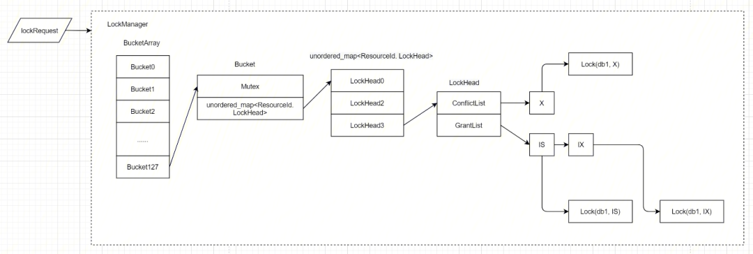 下面分别讨论:首先 LockManager 中存在一个长度为128的 BucketArray,其可以无锁访问,在每一个 lock() 操作中都首先通过 resId % 128来找到对应的 bucket,这里利用了 ResourceId 彼此之间的无关性执行了分桶操作,提高了并发。
