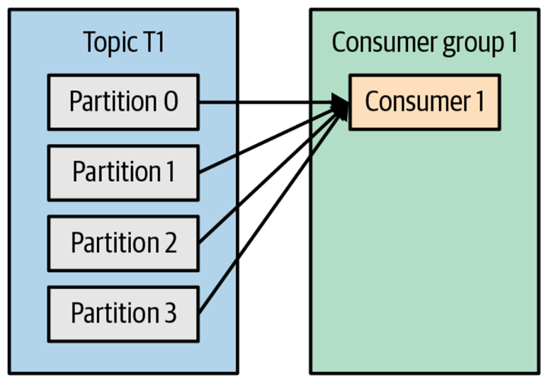 我们用下面这个图来详细介绍一下,TopicT1有四个partition,我们开始只用一个consumer来进行读,如下所示: