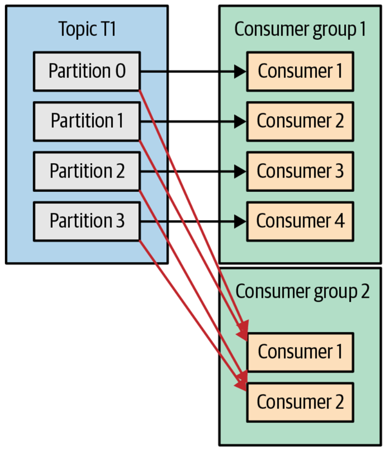 另外一个很常见的情况就是我们有多个应用都需要从同一个topic中读取数据,这个时候就可以创建多个consumer group,不同consumer group中的consumer是可以访问同一个partition的,如下所示,我们引入了consumer group2: