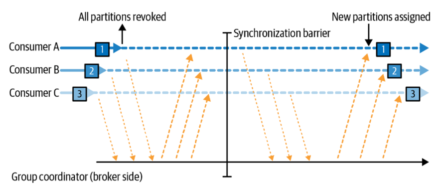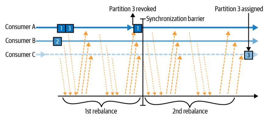 Eager rebalance:这种方法比较绝对,就是当我们要做rebalance的时候,所有的consumer都停止,然后重新joinconsumer group并进行partition的分配,最终恢复数据的consume。这种方式就意味着中间其实是有一个完全不consume的时间的,也就是停止consume的时间。整体时间线如下所示: