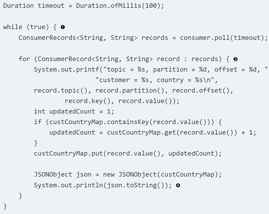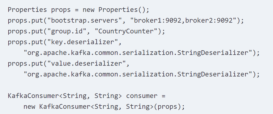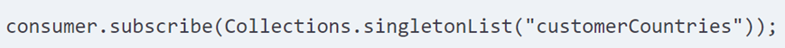 这个代码没有什么特别需要说明的,在创建了consumer之后,我们还需要把这个consumer subscribe到对应的topic(“customerCountries”):