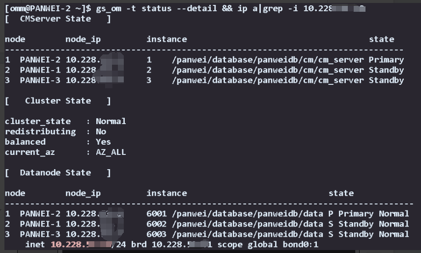 gs_om -t status --detail && ip a|grep -i 10.228.xx.xx