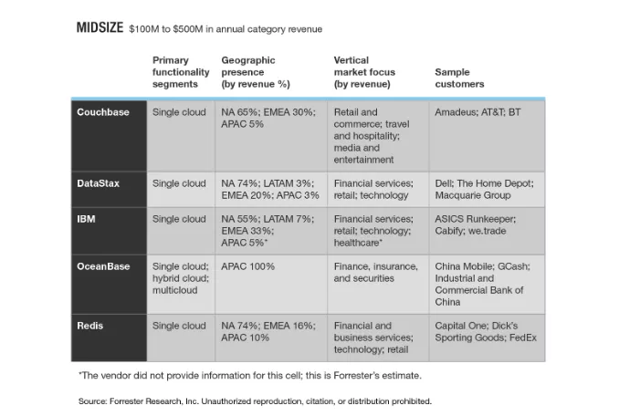 OceanBase 是中等营收规模赛道中唯一一家来自中国的数据库厂商,也是全球唯三具备实现 Forrester 定义的分布式数据库细分功能(单云、混合云、多云)全覆盖的能力的厂商。