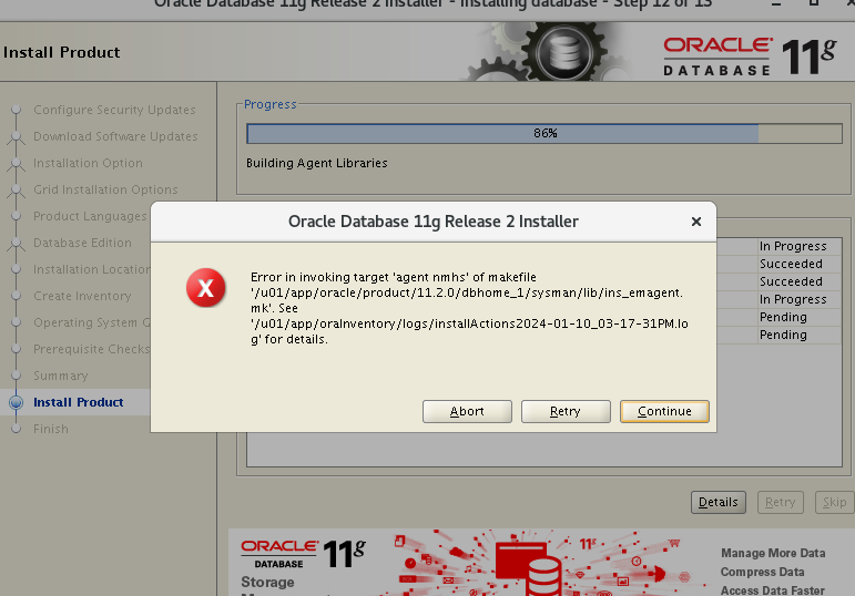 保留安装过程,另外开启一个终端窗口,将ins_emagent.mk文件中的 $(MK_EMAGENT_NMECTL)更改为$(MK_EMAGENT_NMECTL)-lnnz11,(第一个时字母L的小写,后面两个是数字1)然后在安装过程中点击Retry即可。